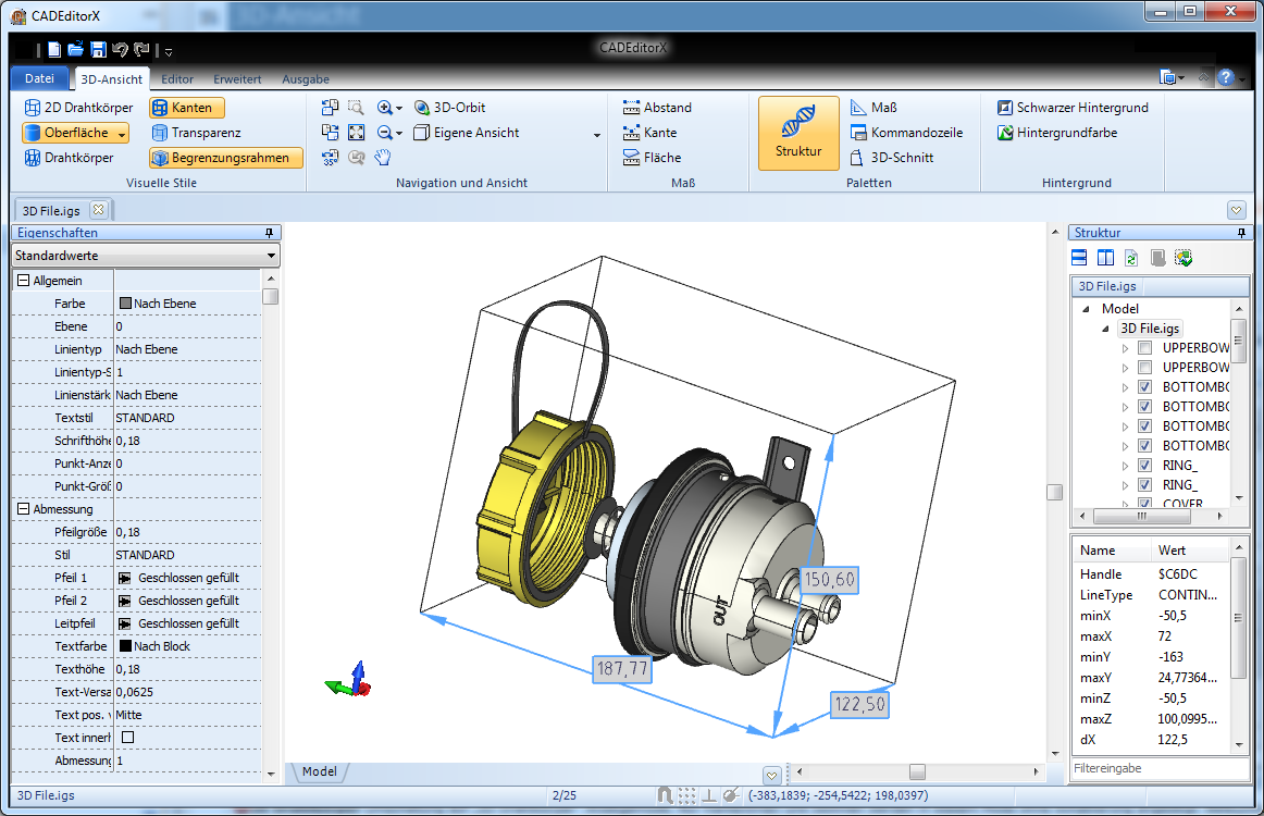 Begrenzungsramen. Ein-/Ausschalten der Außenabmessungen vom ganzen Modell.