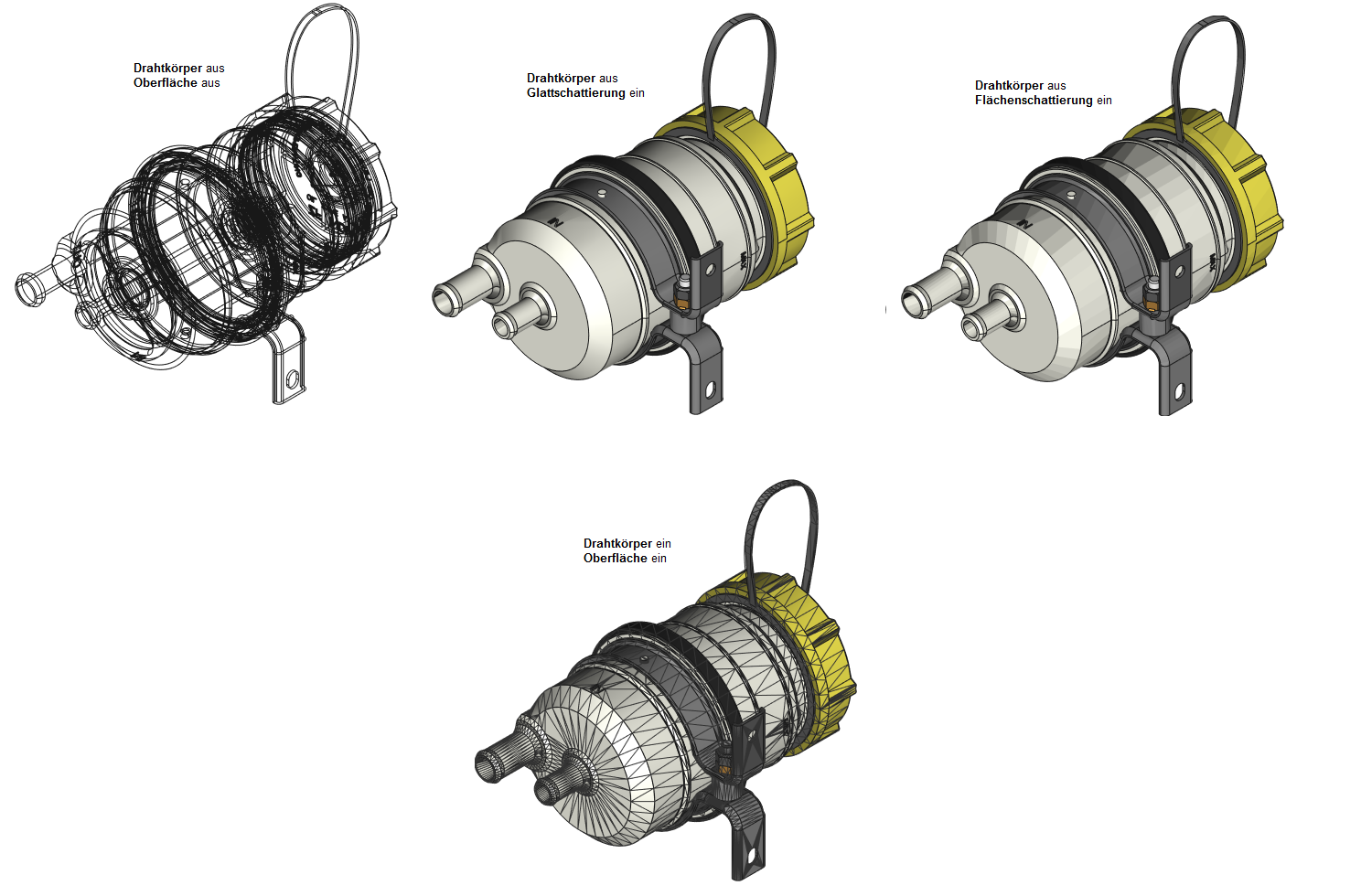 Man kann den visuellen Anzeigestil durch verschiedene Kombinationen von Optionen und Modes einstellen. Die Beispiele für die Verwendung verschiedener Kombinationen von der Option Drahtkörper und den Oberflächenanzeigemodes Glattschattierung, Flächenschattierung und Verdeckte Linien.