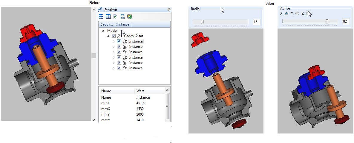 Explosionsansicht. Ein Werkzeug zum Erstellen von Explosionsansicht eines 3D-Modells. Dieses Werkzeug hat zwei Modi: Radial und Achse.