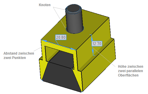 In der 3D-Ansicht gisbt es zwei Weisen, den Abstand zu messen: Zwischen Punkten und Zwischen Kanten. Wenn Zwischen Punkten ausgewählt wird, es wird einen Abstand zwischen den auf dem 3D-Modell festgelegten Punkten gemessen. Zwischen Punkten ermöglicht auch die Vermessung der Höhe zwischen zwei parallelen Flächen. Wenn Zwischen Kanten ausgewählt wird, kann mann einen Abstand zwischen den gewählten parallelen Kanten sowie zwei Kreiszentren messen.