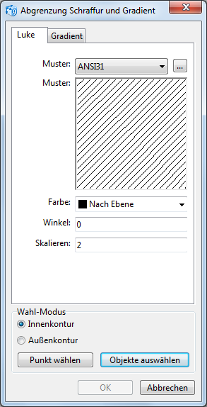 Um eine Schraffur in der Zeichnung zu erschaffen, rufen Sie den Befehl Luke. Die Dialogbox Abgrenzung Schraffur und Gradient wird geöffnet: