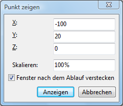 Geben Sie die X, Y und Z - Koordinaten und den gewünschten Skalierfaktor in die Dialogbox ein. Drücken Sie auf 'OK'. Der vorgegebene Punkt wird auf dem Bild mit dem vorgegebenen Maßstab angezeigt. Man kann die Werte mit der Tastatur oder des Mausrads eingeben. Um die Werte zu vergrößern rotieren Sie den Mausrad zu sich.