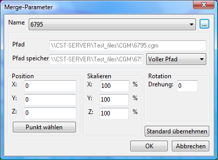 erscheint eine Dialogbox. Die Dialogbox Merge-Parameter erlaubt das Bestimmen der Position, des Maßstabes und des Drehwinkels für die eingefügte Grafik: