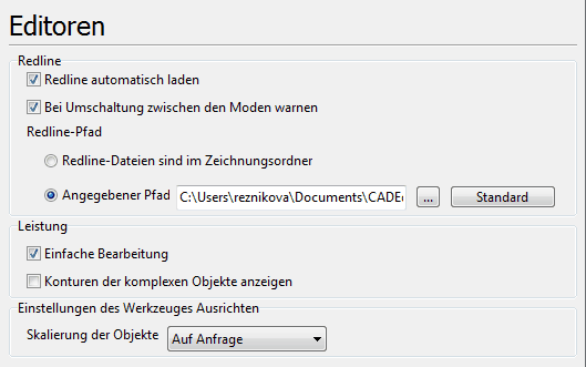 •Redline automatisch laden - schalten Sie diese Option ein, damit CADEditorX-Benutzeroberfläche die Redline - Dateien zusammen mit entsprechenden CAD-Dateien lädt. Die Redline Dateien werden in der Verzeichnis, die in der Gruppe Redline-Pfad dieser Registerkarte des Dialogfensters Einstellungen gesucht. Man darf nicht vergessen, dass die automatische Ladung der Redline Datei nur möglich ist, wenn sein Name bei der Speicherung vordefiniert wurde und der Name der Datei nicht verändert wurde. Er soll so aussehen: DateiName_dxf$$Model.DXF.