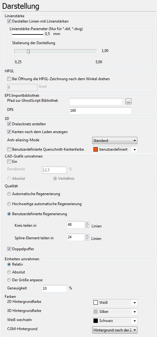 Auf dieser Registerkarte kann man die Einstellungen für die Darstellung von CAD-Dateien anpassen. Die Registerkarte ermöglicht das Festlegen von Anzahl der Linien für Teilen der Kreise oder Spline-Elemente und von Skalierfaktor für die Darstellung der Linienstärke auf einem Bildschirm sowie von anderen Parametern.