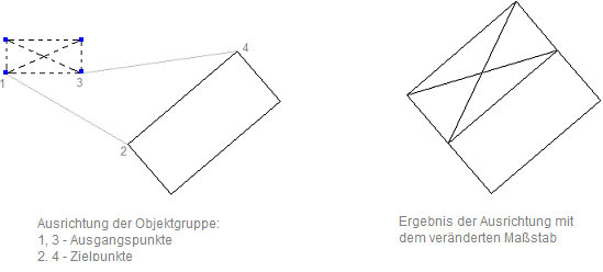 Der Abstand zwischen den ersten und zweiten Zielpunkte ist eine Basisstrecke für die Maßstabänderung der gewählten Objekte bei ihrer Ausrichtung.