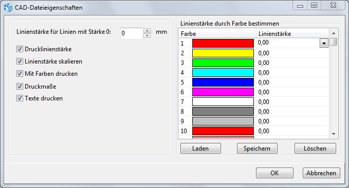 In der Sektion "Linienstärke durch Farbe bestimmen" gibt es die Liste der Farbnummern und die Möglichkeit, die Benutzerstärke für jede Farbe einzustellen. Die Einstellungen für diese Sektion können gespeichert werden oder aus der Datei mit *.cws Erweiterung geladen werden. Die Tasten [Laden] und [Speichern], die unten sind, werden für das benutzt. Die Taste [Löschen] wirft alle erfüllte Einstellungen dieser Sektion ab.