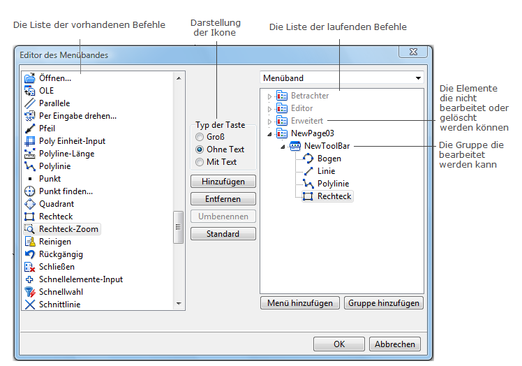 Die Befehle werden zu den früher erschaffenen Werkzeugkästen hinzugefügt. Alle vorhandenen Instrumente sind im linken Teil des Dialogfensters "Editor des Menübandes". Diese Liste wirkt mit der Liste der laufenden Befehle mittels der Knöpfe Hinzufügen, Entfernen, Umbenennen, Standard zusammen. Dabei wird das hinzuzufügende Element in der Liste der vorhandenen Befehle gewählt und der Werkzeugkasten, wo das Element sich befinden soll, wird in der Liste der laufenden Befehle festgelegt. Es ist möglich die Lage der hinzugefügten Instrumente in der Liste zu bearbeiten. Dafür verschieben Sie es mit der Maus.
