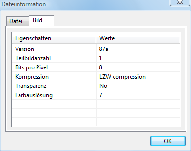 Das Dialogfenster Dateiinformation für die Dateien der Rasterformate und Metafiles hat die Registerkarte Bild, deren Inhalt von dem Format der geladenen Datei abhängt. Unten ist ein Beispiel für GIF Format.