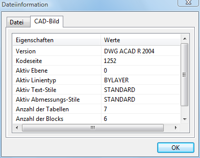 Das Dialogfenster Dateiinformation für die CAD Dateien hat die zweite Registerkarte CAD-Bild, die ausführliche Information über die Datei hat: die Version, die Kodeseite, die aktive Ebene, den aktiven Linientyp, den aktiven Text-und Abmessungs-Stil, die Anzahl der Tabellen, Blocks und Einheiten.