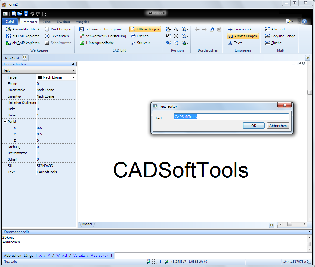 CADEditorX-Benutzeroberfläche hat die große Anzahl der Werkzeuge für das Editieren der 2D Zeichnungen. Sie können die neuen Grundelemente hinzufügen, die Objekte aus der Zeichnung löschen, umstellen, kopieren, die Objekteigenschaften ändern und so weiter.