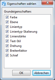 Man kann die folgenden Eigenschaften kopieren: Farbe, Ebene, Linientyp, Linientyp-Skalierung, Linienstärke, Schraffurmuster. Wenn man die Eigenschaften eines Textes anpasst, sind auch die folgenden Eigenschaften vorhanden: Text-Stil, Drehung, Breitenfaktor, Schief.
