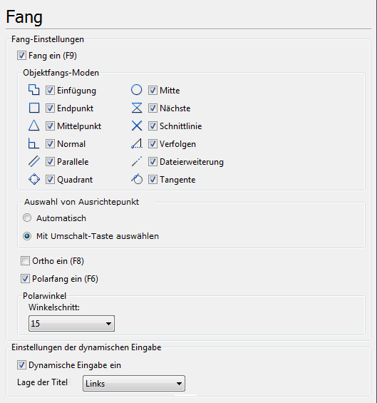 Die Registerkarte enthält die Einstellungen für Fang, Polarfang, Dynamische Eingabe und Ortho.