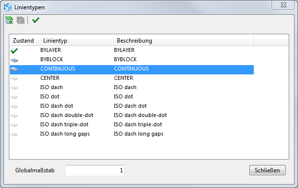 Liste der Linientypennamen mit der Textbeschreibung, die in der Zeichnung geladen worden. Gegenüber dem aktuellen Linientyp ist der grüne Haken. Gegenüber den Linientypen, die in der Zeichnung benutzt werden, ist ein dunkel-graue Blatt dargestellt. Gegenüber den Linientypen, die in der Zeichnung nicht benutzt werden, ist ein hell-graue Blatt dargestellt.