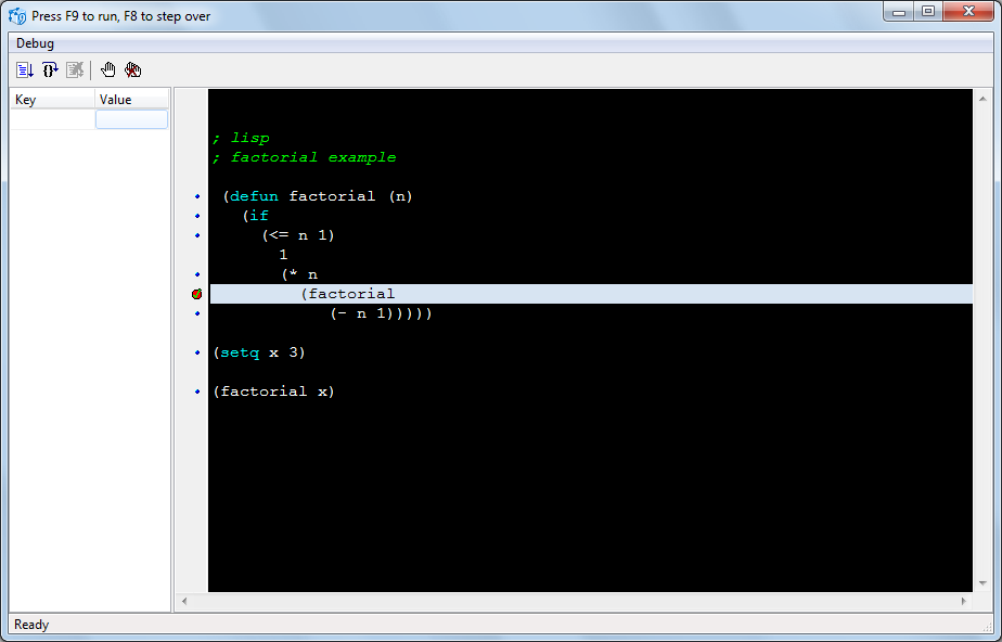 Der eingelassene LISP Debugger sichert die notwendige Funktionalität für das Austesten Ihres Programms.