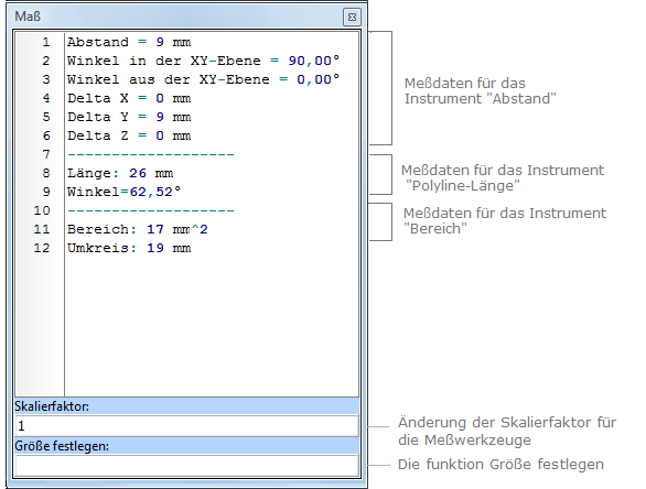 Die Werte der bekommenen Messungen hängen von dem im Dialogfenster Einstellungen unter der Registerkarte Maß festgelegten Skalierfaktor ab. Er kann automatisch ausgerechnet oder manuell eingegeben werden. Die Option Angezeigte Zeichnungs-Einheiten im Dialogfenster Einstellungen bestimmt die Maßeinheiten darin die Messungen in der Palette darstellt werden. Es gibt drei vorgewählten Meßeinheiten: Meter, Millimeter und Zoll.