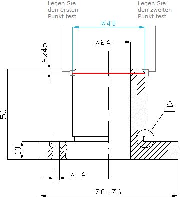2.Messen Sie einen beliebigen Teil der Hauptansicht. Verwenden Sie den Modus Fang [F9]. Messen Sie, zun Beispiel den oberen Teil des Werkstücks, dessen Diameter 40 ist. Die Meßlinie wird auf der Zeichnung mit der roten Farbe gezeigt. Die Ergebnisse werden in der Maß-Palette dargestellt.
