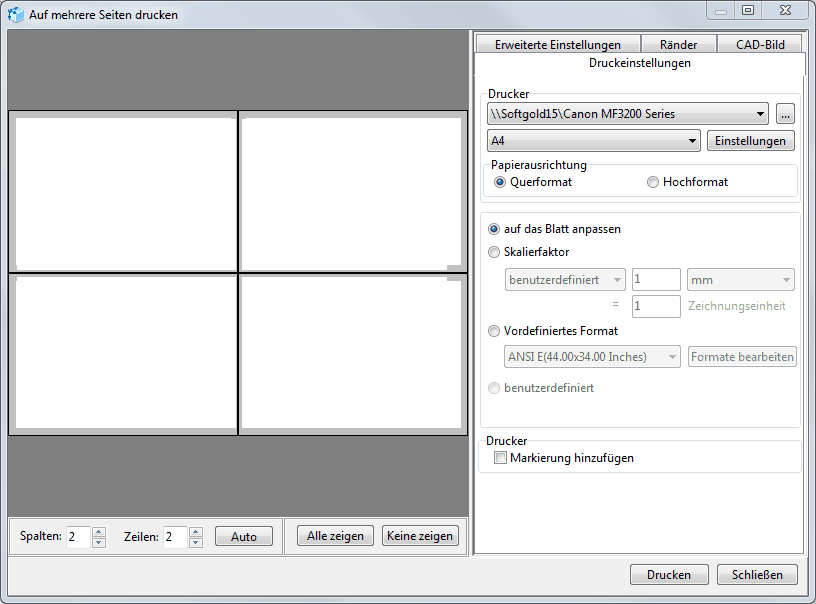 Bei dem Druck aus dem Fenster "Auf mehrere Seiten drucken" bekommt der Nutzer die Möglichkeit, eine große Anzahl der Druckeinstellungen zu verändern. Die Option "Auf mehrere Seiten drucken" erlaubt den Druck auf mehreren Seiten zu realisieren. Zum Beispiel, kann die Zeichnung des großen Formats auf mehreren Seiten des kleineren Formats gedruckt werden.