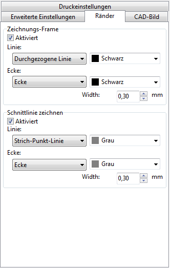 Diese Option ist im Fall der Druck einer großen Zeichnung auf mehreren Blättern, die nachher zusammengeklebt werden, brauchbar. Beim Aktivieren der Option werden die gedruckten Blätter, die Linie enthalten, wo der Rand abgeschnitten sein muss. Dabei kann die Farbe, die Breite und der Typ der Schnittlinie von dem Benutzer definiert sein.