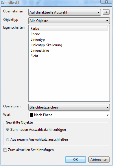 Legt die Objekteigenschaften für den Filter fest. Es enthält die Liste aller Eigenschaften für aktuell ausgewählte Projekte. Diese Eigenschaften werden für die Auswahl genutzt. Ausgewählte Eigenschaft legt zusätzliche Optionen fest, die in den Listen Operatoren und Wert vorhanden sind. Hier ist die Liste der für alle Objekte vorhandenen Eigenschaften: Farbe, Ebene, Linientyp, Linientyp-Skalierung, Linienstärke, Sicht.