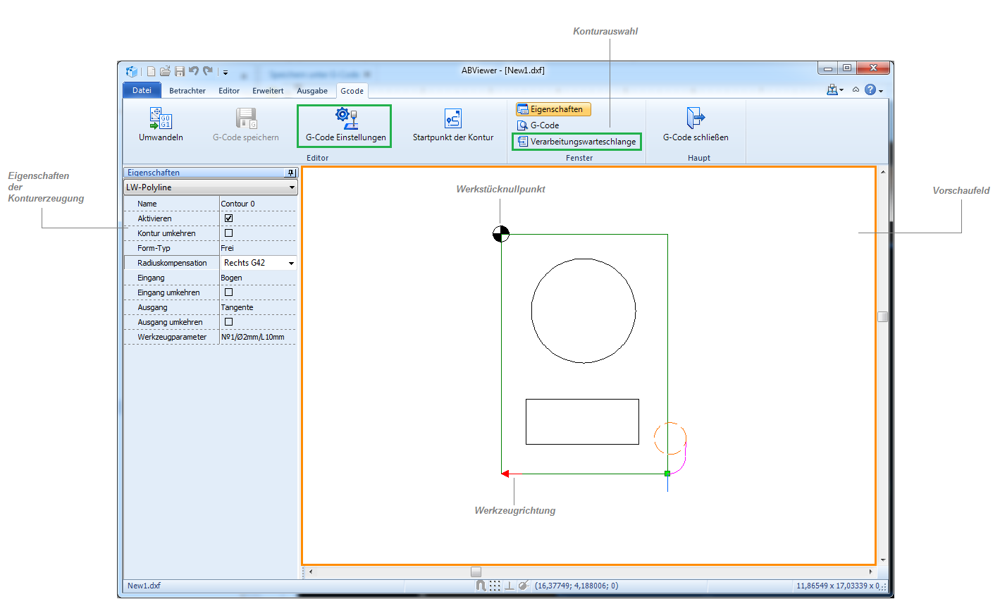 Das Vorschaufeld zeigt die geöffnete Zeichnung, den Werkstücknullpunkt, den Anfangspunkt des Werkzeugbewegung, die Richtung des Werkzeugs, die Weise des Ein-/Ausgangs und das Werkzeug an. Man kann die Anzeige der Elemente im Vorschaufeld auf der Registerkarte Farblegende in das Fenster G-Code Einstellungen einrichten.