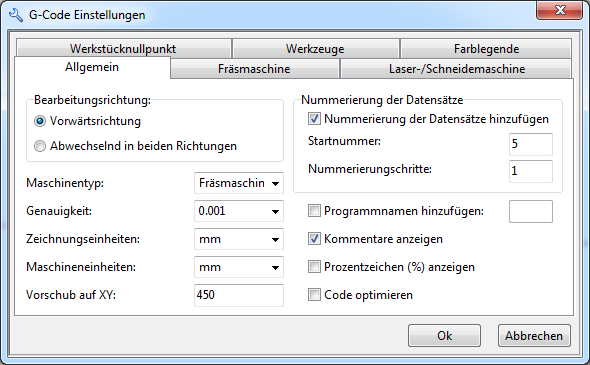 Das Fenster G-Code Einstellungen enthält die folgenden Registerkarten mit Einstellungen: Allgemein, Werkzeuge, Werkstücknullpunkt, Laser-/Schneidemaschine, Fräsmaschine, Farblegende.