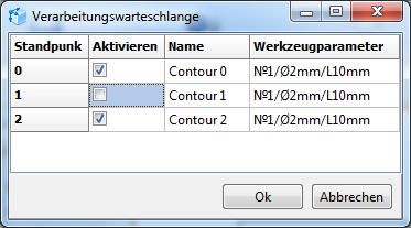 Im Fenster Verarbeitungswarteschlange stellt man die Konturenverarbeitungsreihenfolge ein. Um die Konturposition zu ändern, benutzen Sie die Elemente des Kontextmenüs. Mit einem Häkchen markierte Konturen werden in G-Code umgewandelt.