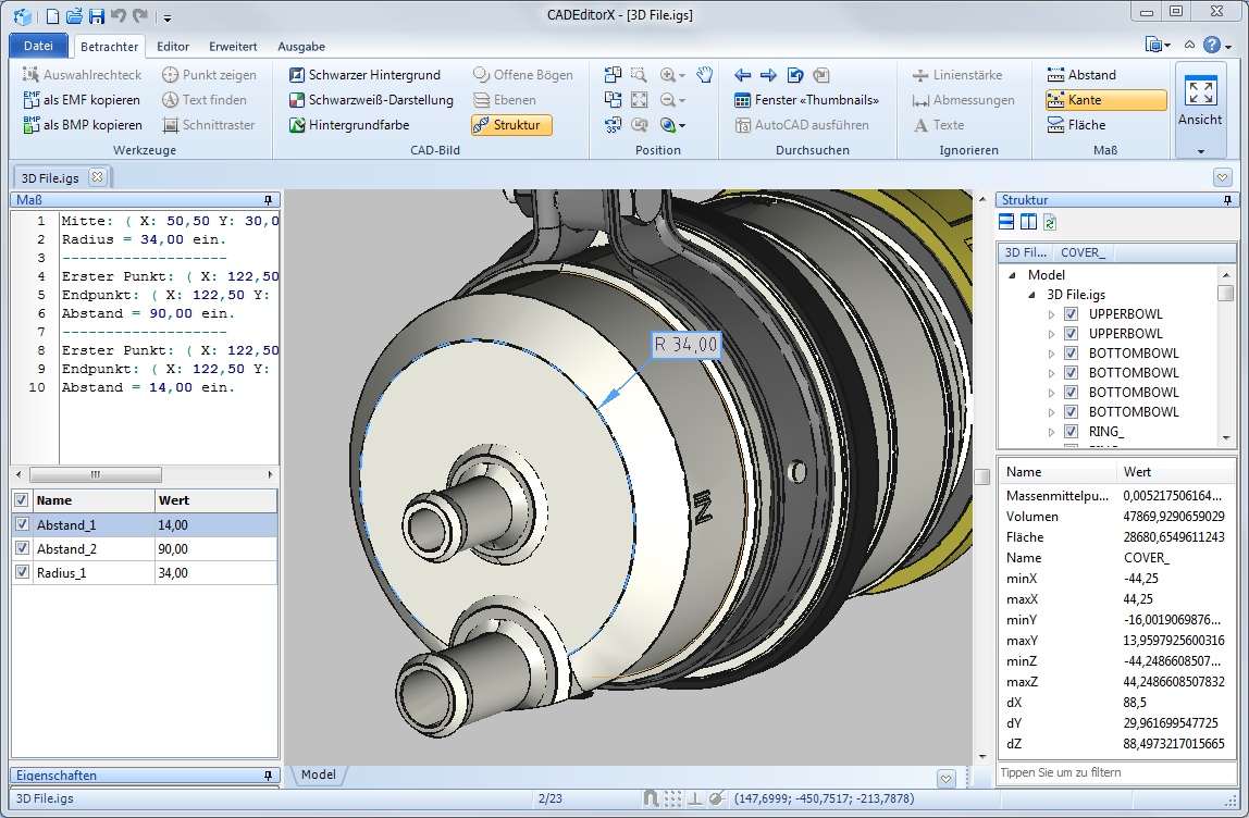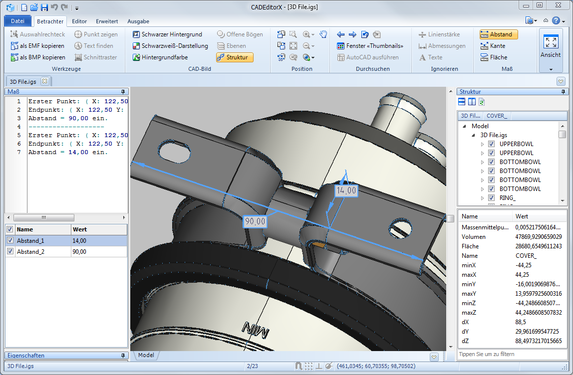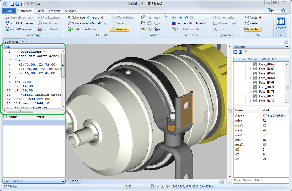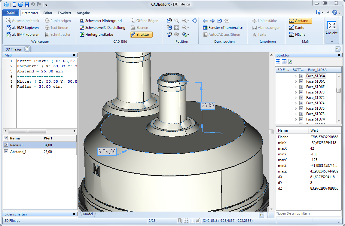 In den Panelen Struktur und Eigenschaften wird Gesamtinformation über das gewählten Objekt gezeigt. Um die detaillierter Information zu erhalten, benutzen Sie die Maß-Werkzeuge aus der Registerkarte Betrachter im Maß-Panel.