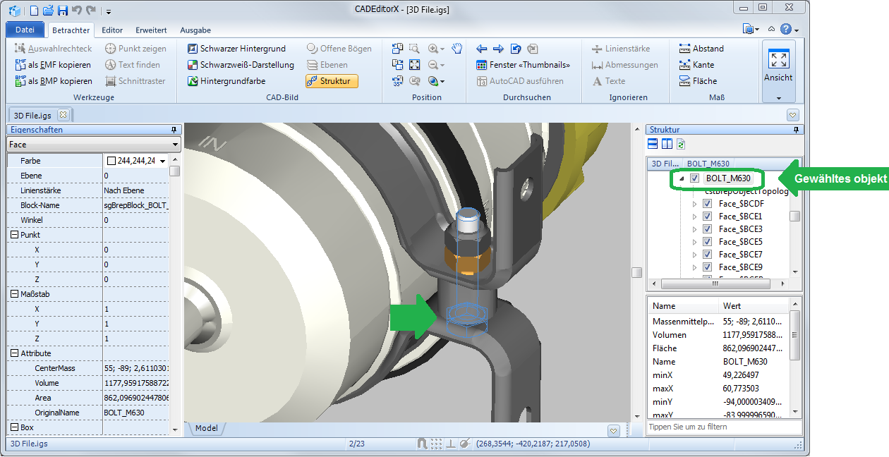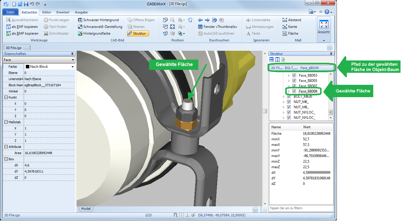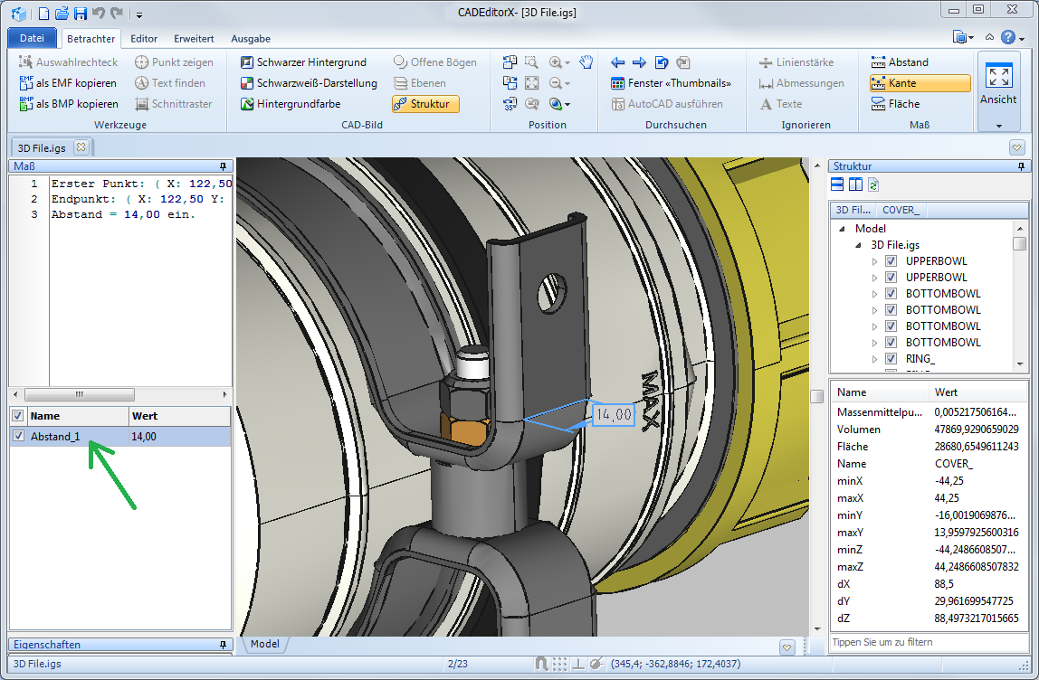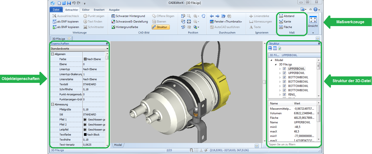 In den Panelen Struktur und Eigenschaften wird Gesamtinformation über das gewählten Objekt gezeigt. Um die detaillierter Information zu erhalten, benutzen Sie die Maß-Werkzeuge aus der Registerkarte Betrachter im Maß-Panel.