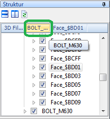 4.Im Struktur-Panel ist es gezeigt, dass die Fläche der Schraube, Face_$BD09 genannt, gewählt wird (nicht die ganze Schraube). Um alle Elemente der Schraube zu wählen, wählen Sie im Struktur-Panel das übergeordnete Element dieser Fläche. Es ist bequem den vollständigen Pfad zum Objekt, das oben des Objektbaums gezeigt ist, zu benutzen. Im unseren Beispiel ist der Name des übergeordneten Elements wie folgt: "BOLT_...". Wenn man auf es mit der linken Maustaste klickt, werden die Zeichnungsobjekte, die dieser gewählten Gruppe gehören, hervorgehoben: