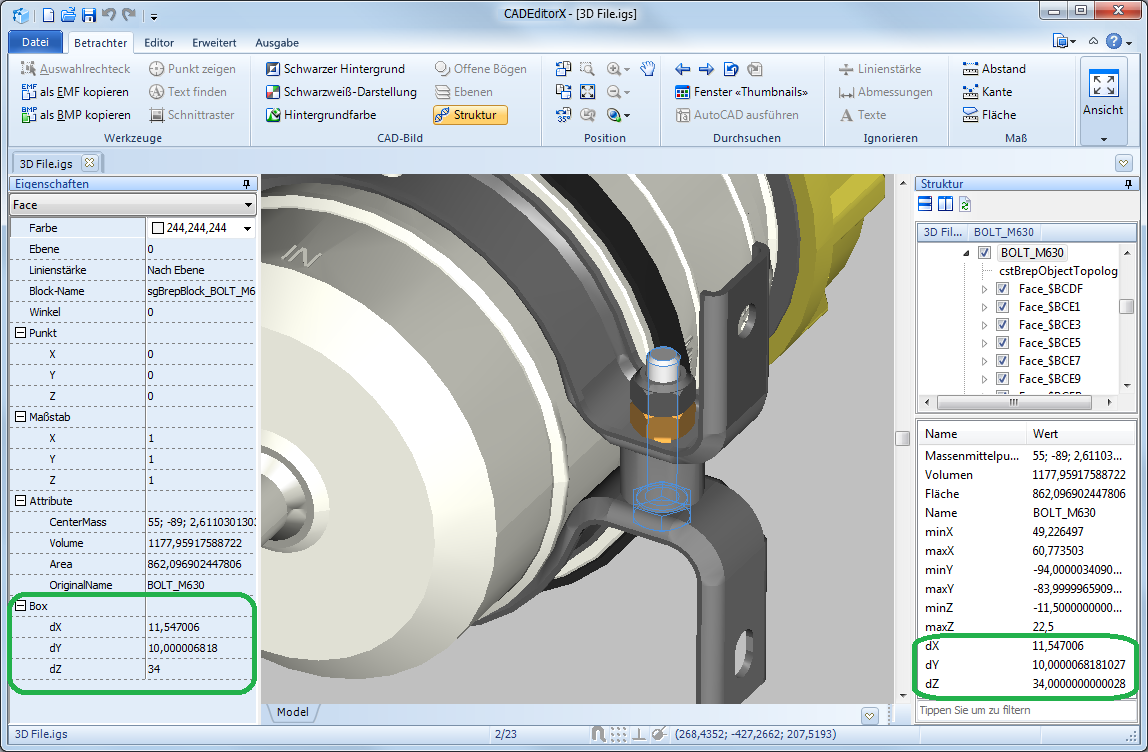 In den Step- und IGES-Dateien können die Objekte des 3D-Modells in die Gruppe zusammengeschlossen. CADEditorX-Benutzeroberfläche zeigt die Hauptabmessungen nicht nur für die Fläche (Oberfläche) des Teils, sondern auch für die Gruppe, der das Teil gehört. Um die Abmessungen zu erhalten, machen Sie Folgendes: