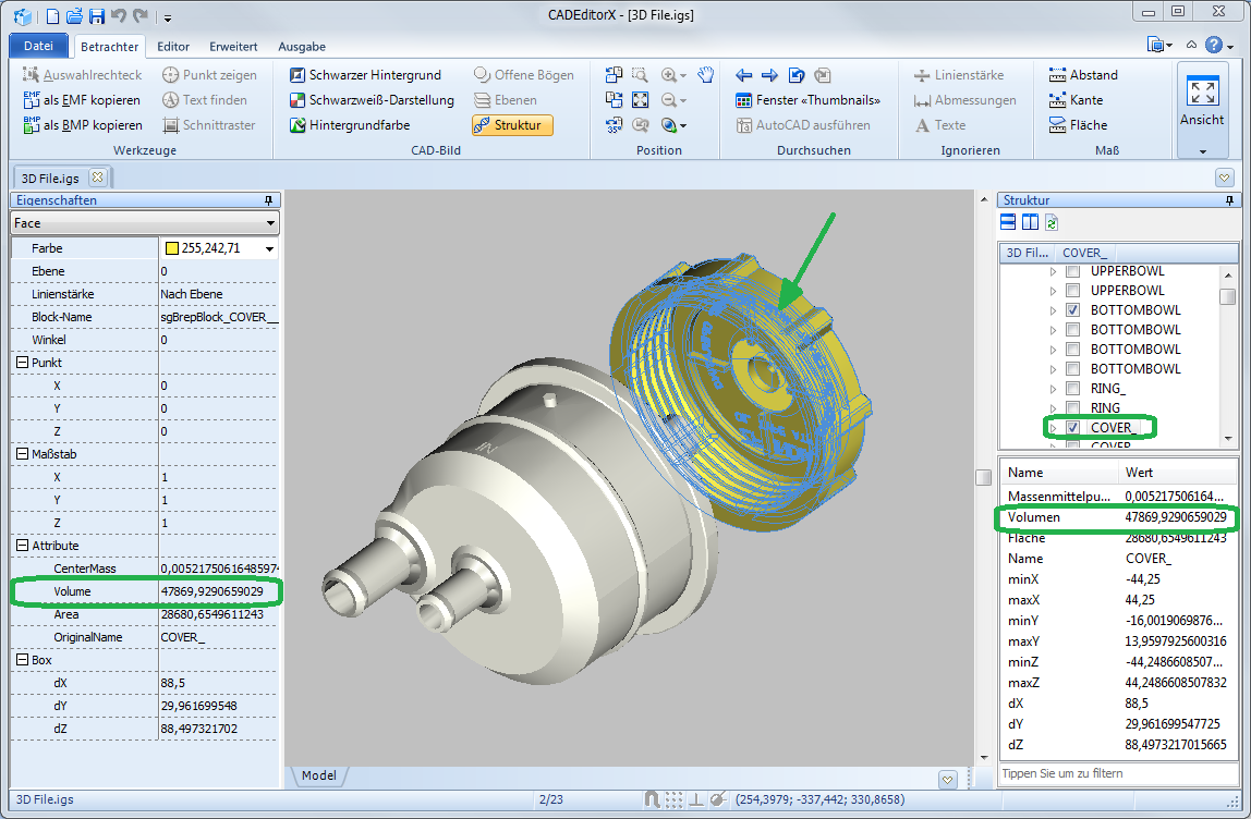 Um das Volumen des 3D-Modells zu erhalten, machen Sie bitte Folgendes: