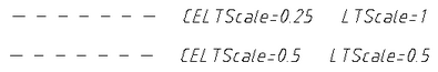 Разбивка типа линии на чертеже выполняется с учетом глобального масштаба, который задается переменной LTScale. Например, линии, для которых заданы следующие значения переменных, на чертеже будут выглядеть одинаково:
